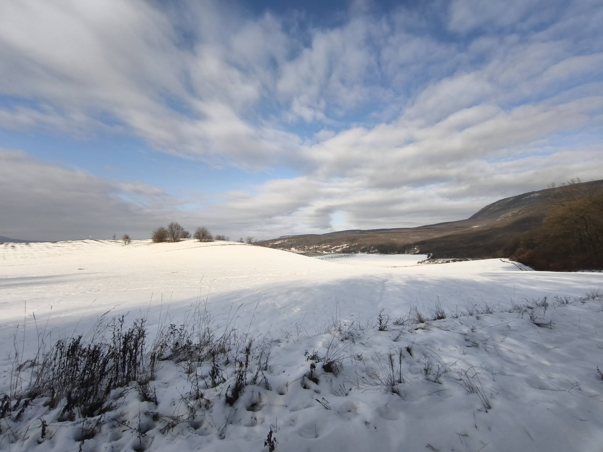 Piliscsév határában előbukkant a Pilis-tető is a napsütésben. A hó olvadni kezdett – még minden fehér volt, de a lépteink nyomán vizes, latyakos lett a talaj. Az egyik kanyarnál egy tanyán hangos bégetésre lettünk figyelmesek – a leghangosabb egy kicsi plüss-szerű bárány volt, aki oda is jött egy kis simogatásra.